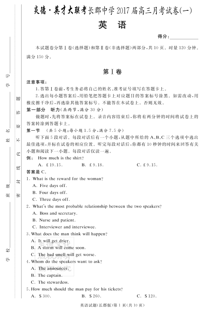 【英語】炎德英才大聯考2017長郡中學高三1次月考