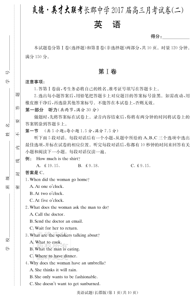 【英語(yǔ)】炎德英才大聯(lián)考2017長(zhǎng)郡中學(xué)高三2次月考