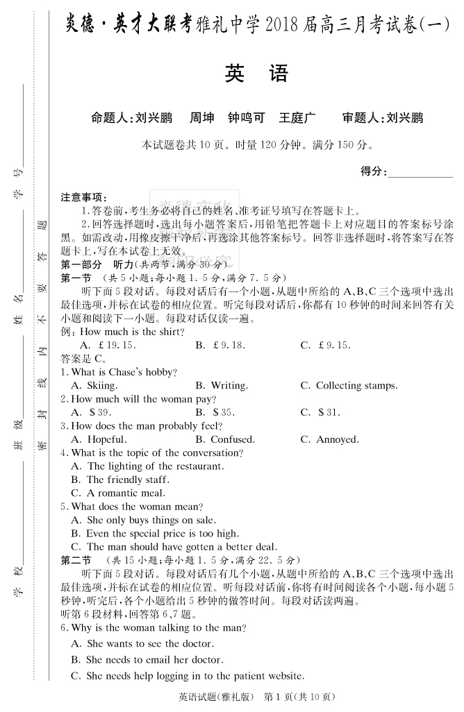 【英語】炎德英才大聯考2018雅禮中學高三1次月考