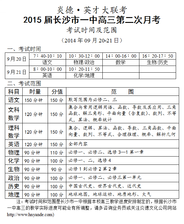 炎德英才大聯(lián)考長(zhǎng)沙市一中2015屆高三第2次月考考試時(shí)間和范圍(2014.09.20-21)