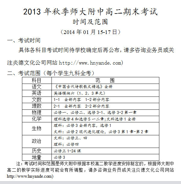上一篇:2013年秋季師大附中高二第三次月考考試時間和范圍(2013.12.6-7)