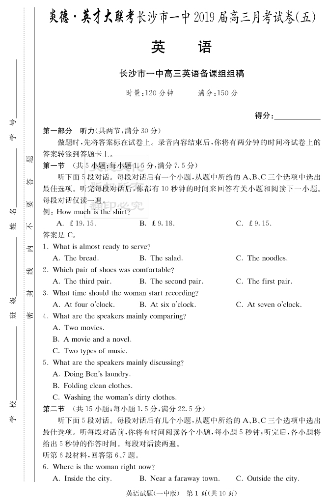 【英語】炎德英才大聯(lián)考2019長沙一中高三5次月考