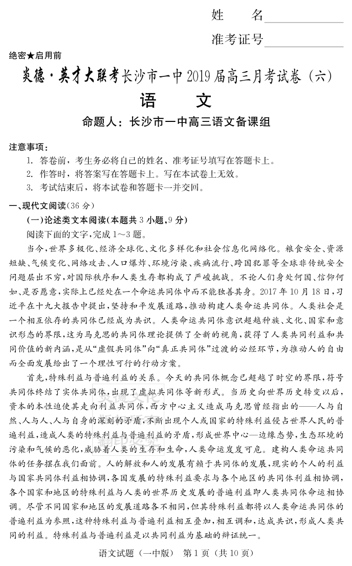【語文】炎德英才大聯(lián)考2019長沙一中高三6次月考