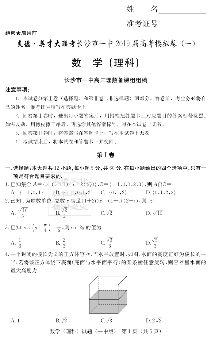 【理數(shù)】炎德英才大聯(lián)考2019長(zhǎng)沙一中高三10次月考(模擬一)