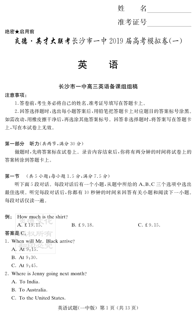 【英語】炎德英才大聯(lián)考2019長沙一中高三10次月考(模擬一)