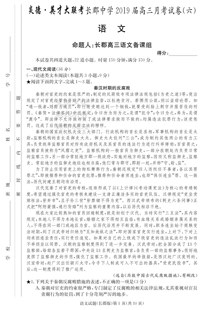 【語文】炎德英才大聯考2019長郡中學高三6次月考