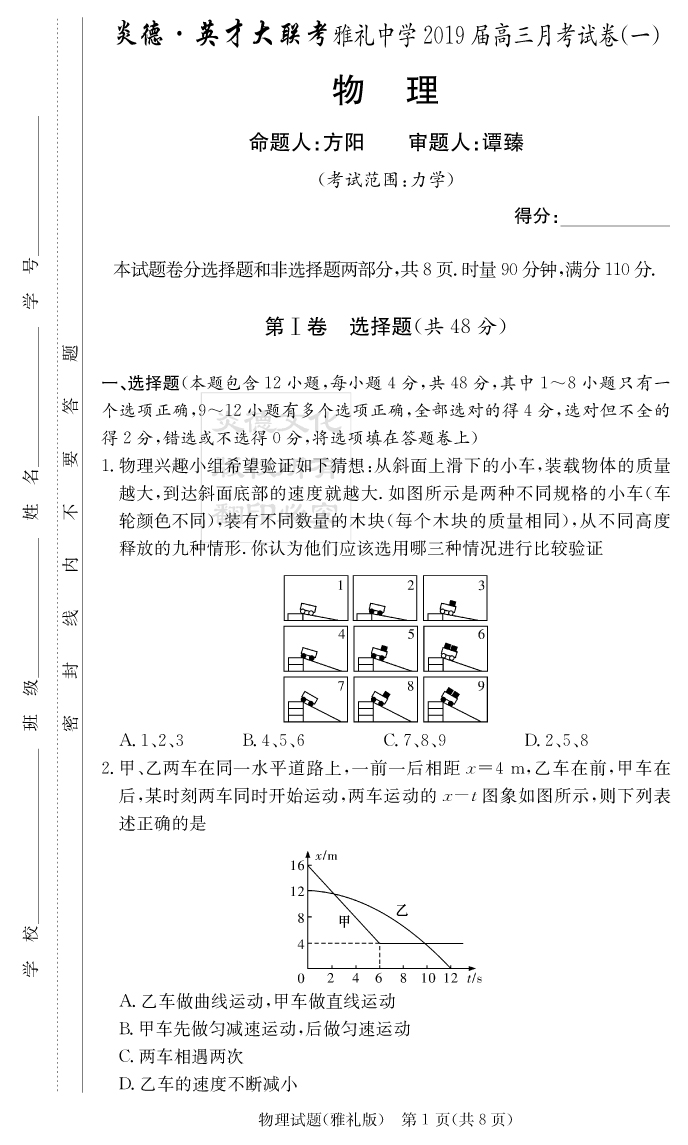 【物理】炎德英才大聯考2019雅禮中學高三1次月考