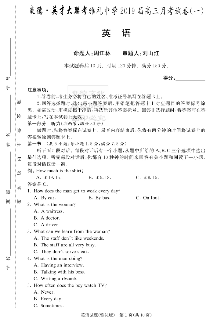 【英語】炎德英才大聯(lián)考2019雅禮中學(xué)高三1次月考