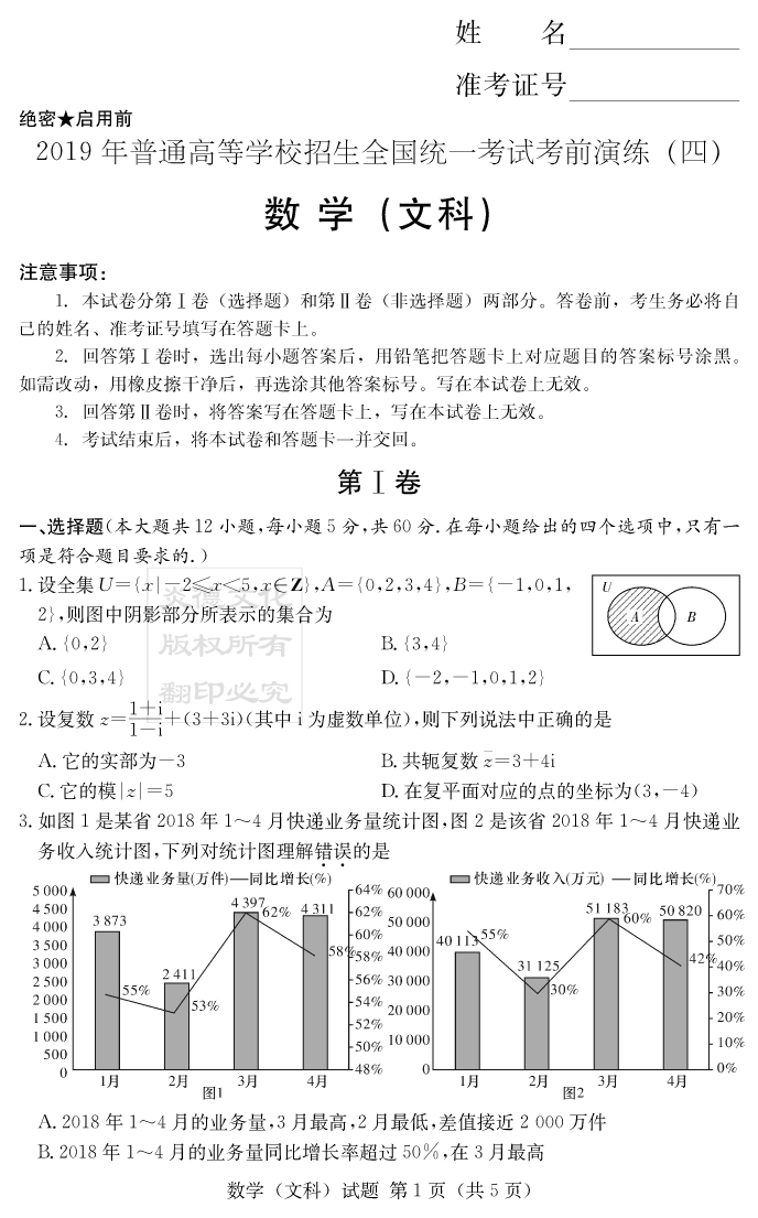 【文數】2019年普通高等學校招生全國統一考試考前演練(四)