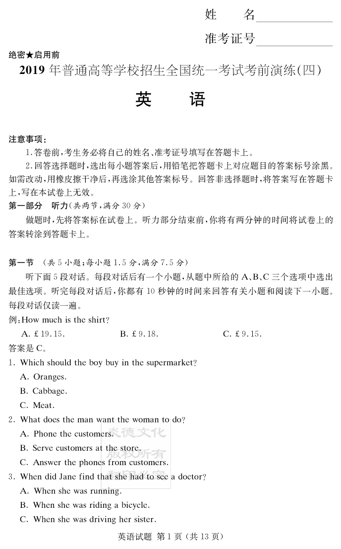 【英語】2019年普通高等學校招生全國統一考試考前演練(四)