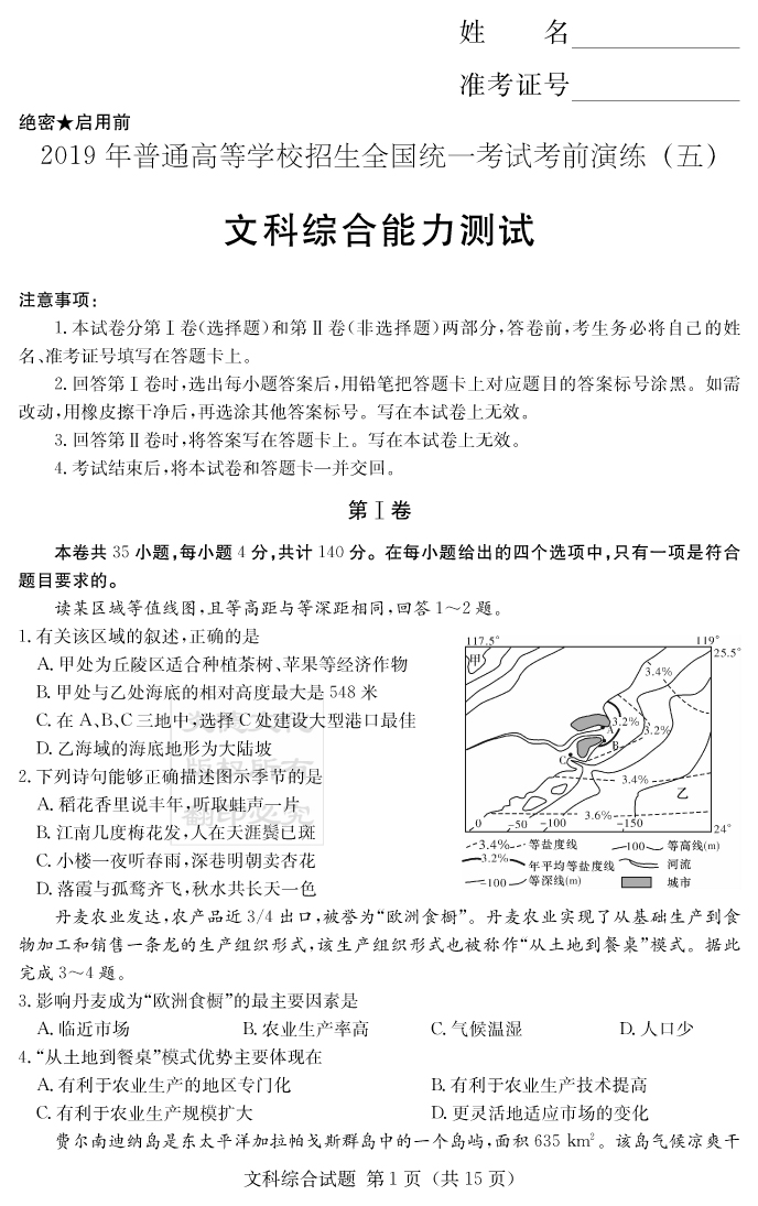 【文綜】2019年普通高等學校招生全國統一考試考前演練(五)