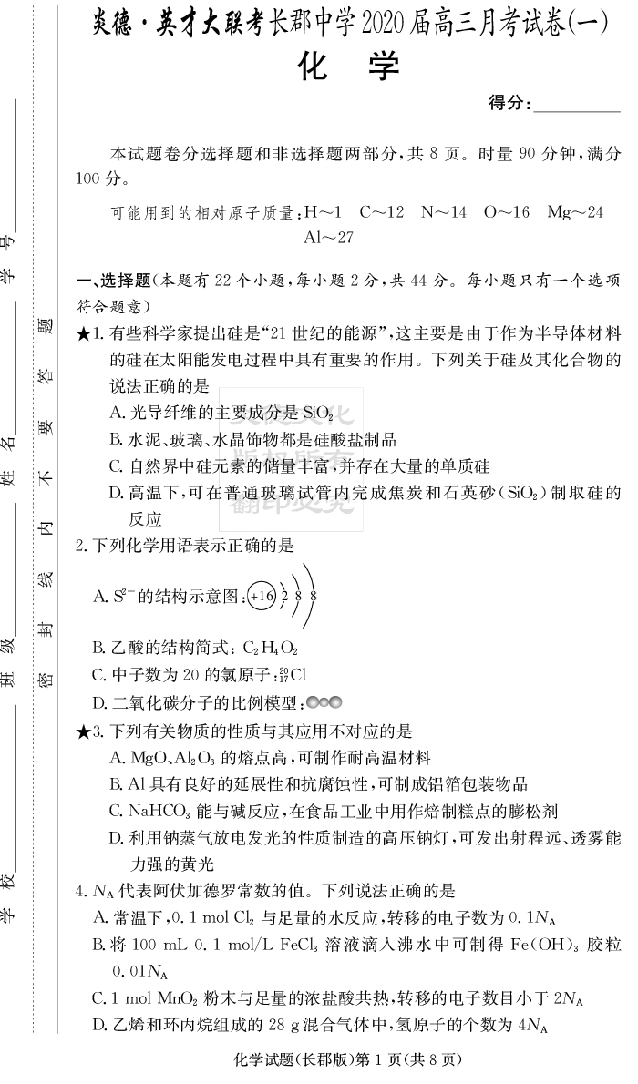 【化學(xué)】炎德英才大聯(lián)考2020屆長郡中學(xué)高三1次月考