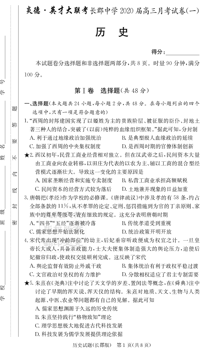 【歷史】炎德英才大聯考2020屆長郡中學高三1次月考
