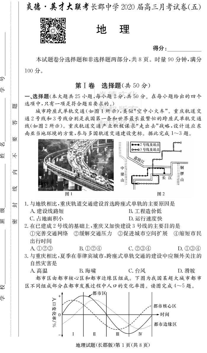 【地理】炎德英才大聯(lián)考2020屆長(zhǎng)郡中學(xué)高三5次月考