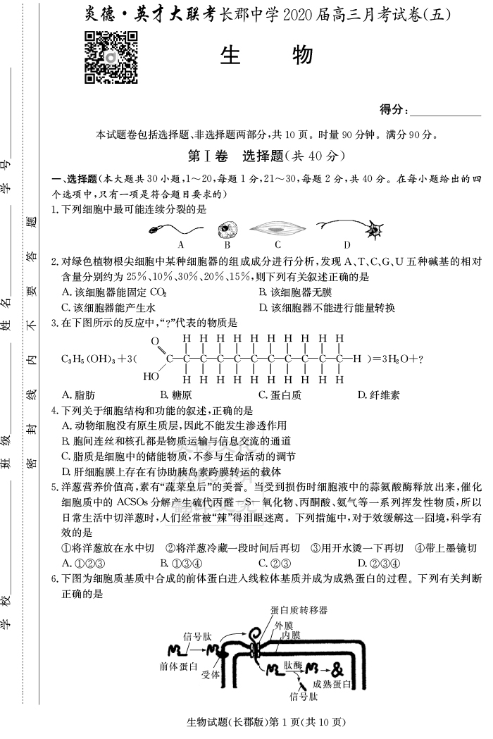 【生物】炎德英才大聯考2020屆長郡中學高三5次月考