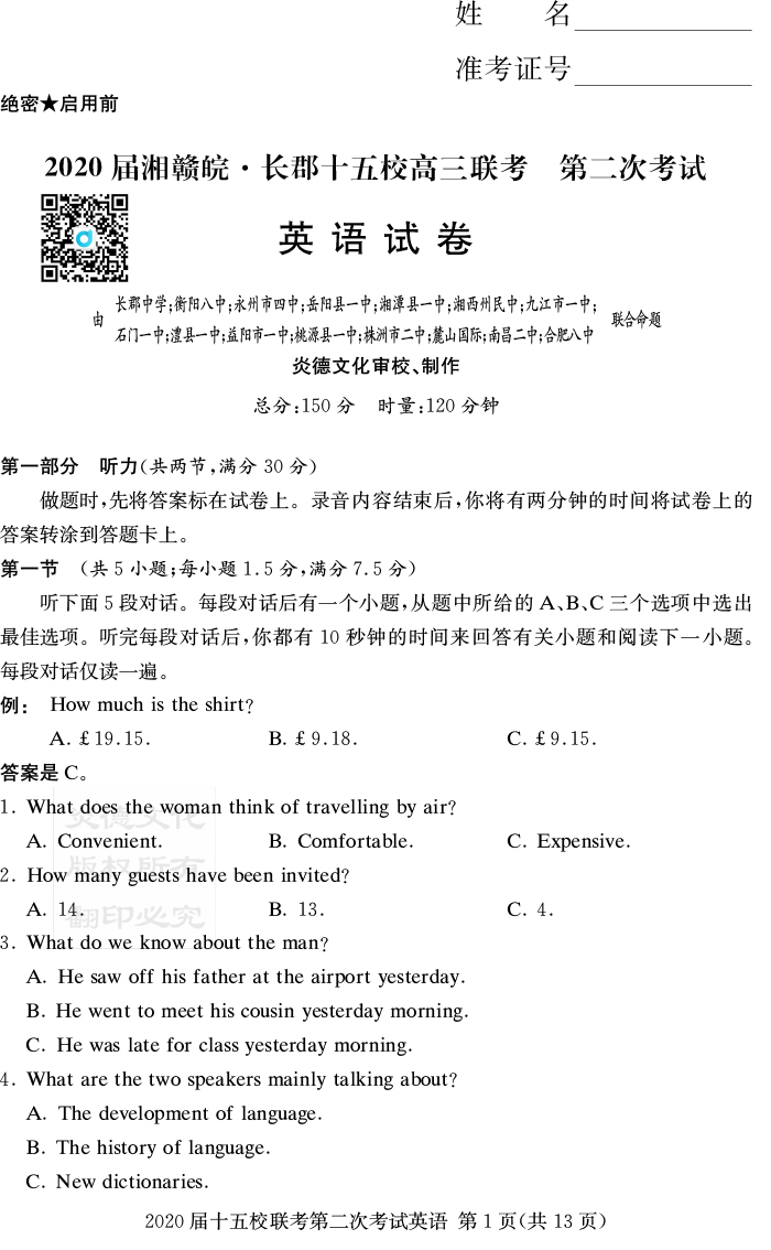 【英語】炎德英才大聯考2020屆長郡中學高三8次月考(十五校聯考一)