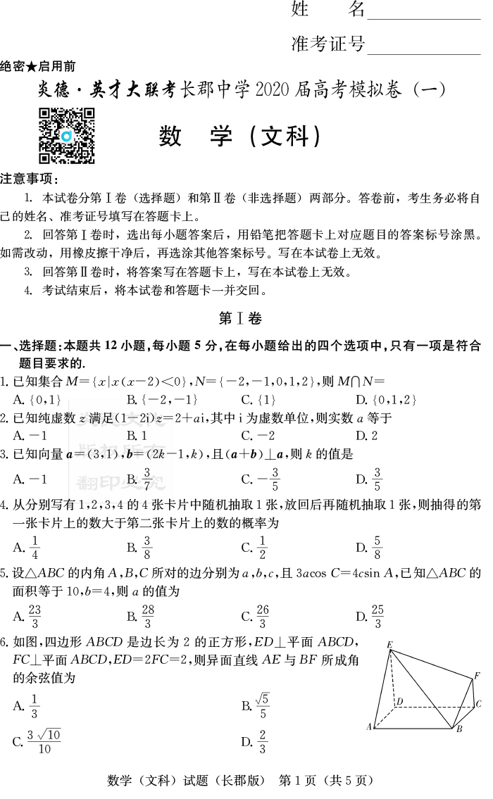 【文數(shù)】炎德英才大聯(lián)考2020屆長郡中學高三9次月考(模擬一)