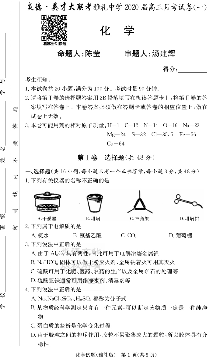 【化學】炎德英才大聯考2020屆雅禮中學高三1次月考