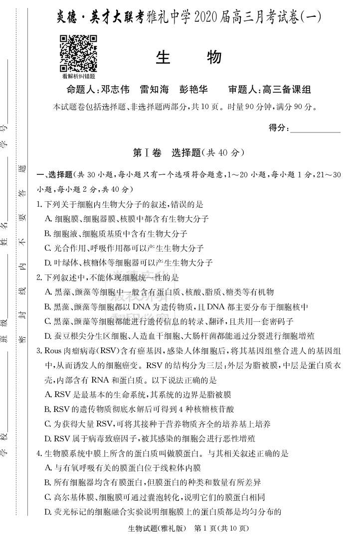 2026高考總復習單元同步滾動測試卷·生物