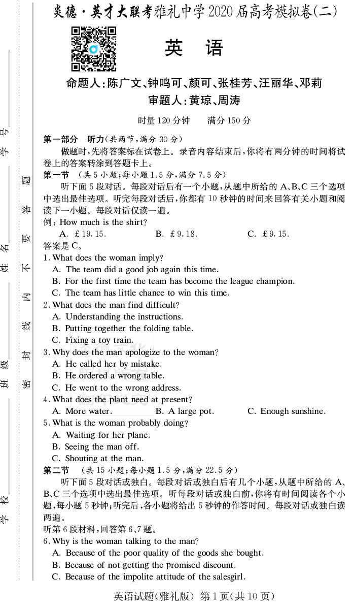 【英語】炎德英才大聯考2020屆雅禮中學高三11次月考(模擬二)