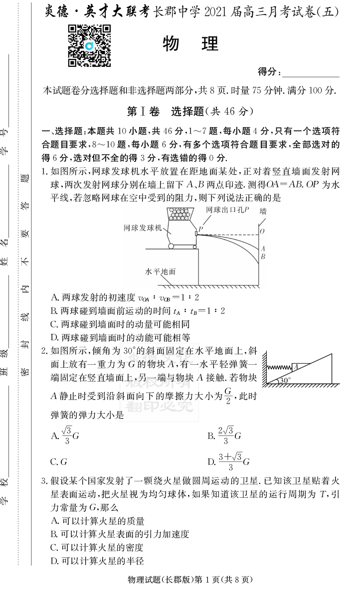 【物理】炎德英才大聯(lián)考2021屆長郡中學(xué)高三5次月考