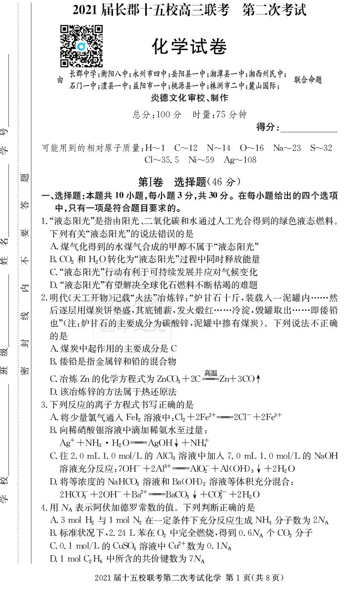 【化學】炎德英才大聯考2021屆長郡中學高三8次月考(十五校聯考二)
