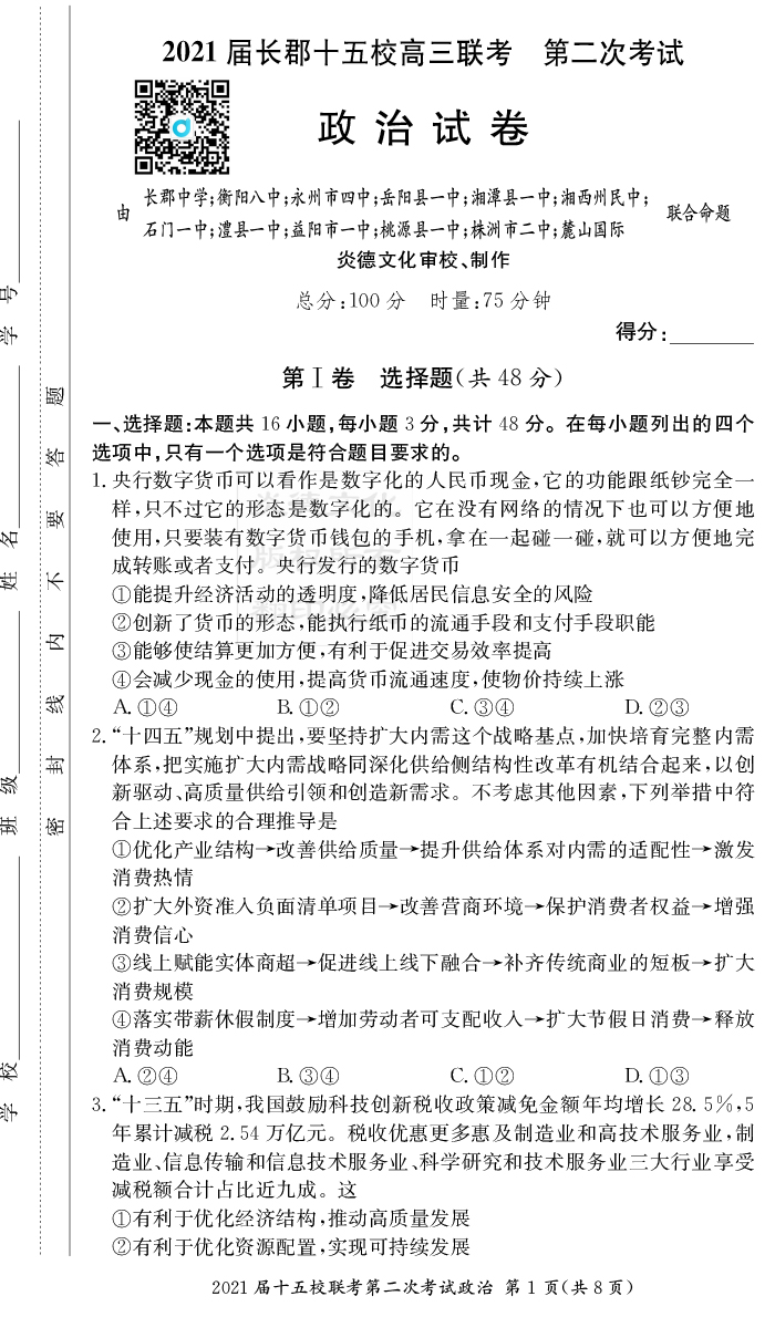 【政治】炎德英才大聯考2021屆長郡中學高三8次月考(十五校聯考二)
