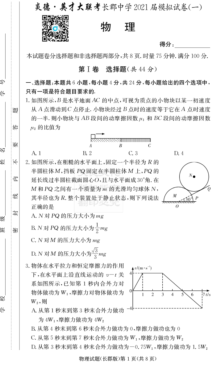 【物理】炎德英才大聯考2021屆長郡中學高三9次月考(模擬一)