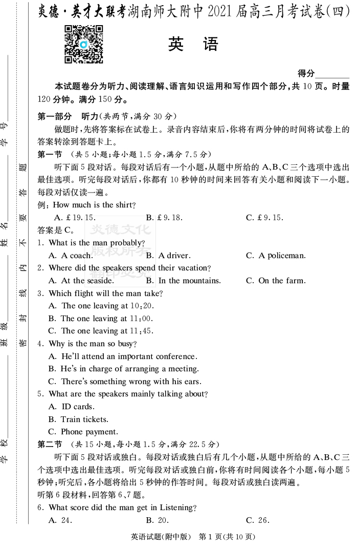 【英語】炎德英才大聯考2021屆湖南師大附中高三4次月考