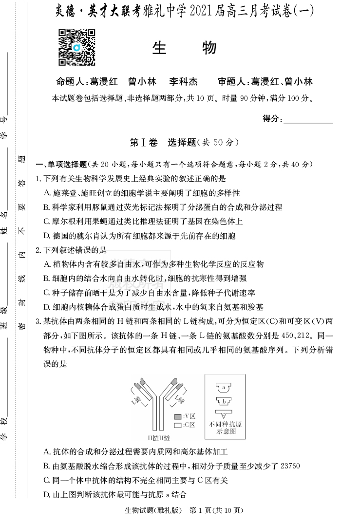 【生物】炎德英才大聯考2021屆雅禮中學高三1次月考