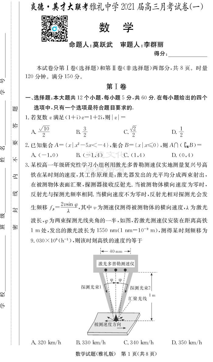 【數學】炎德英才大聯考2021屆雅禮中學高三1次月考