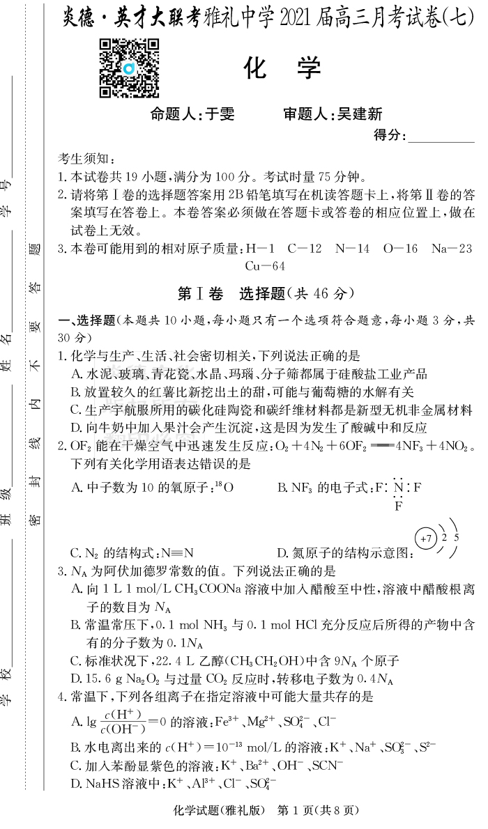 【化學】炎德英才大聯考2021屆雅禮中學高三7次月考