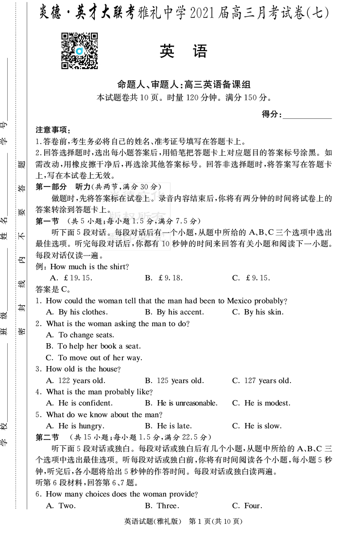 【英語(yǔ)】炎德英才大聯(lián)考2021屆雅禮中學(xué)高三7次月考