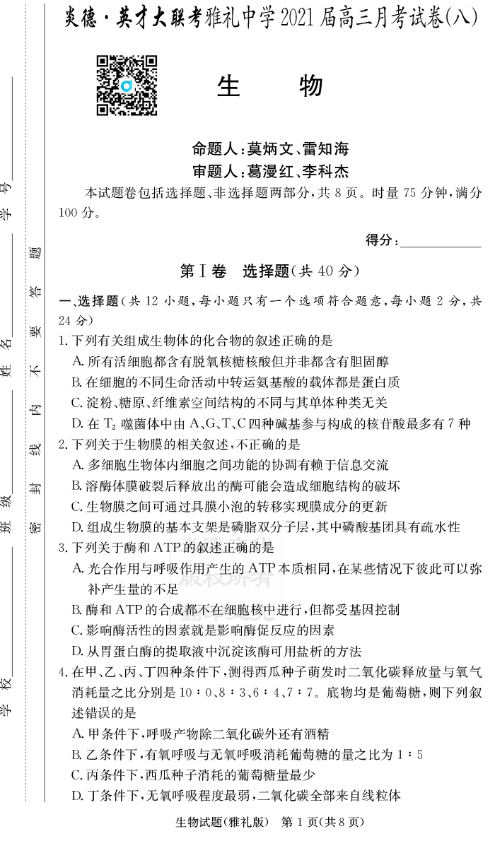 【生物】炎德英才大聯考2021屆雅禮中學高三8次月考