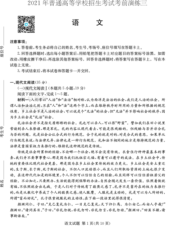 【語文】2021年普通高等學(xué)校招生全國統(tǒng)一考試考前演練(三)