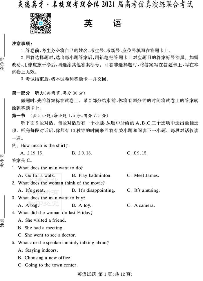 【英語】2021年普通高等學(xué)校招生全國統(tǒng)一考試考前演練(五)