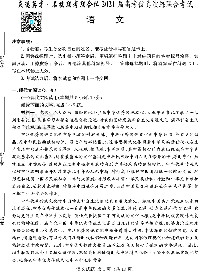 【語文】2021年普通高等學校招生全國統一考試考前演練(五)
