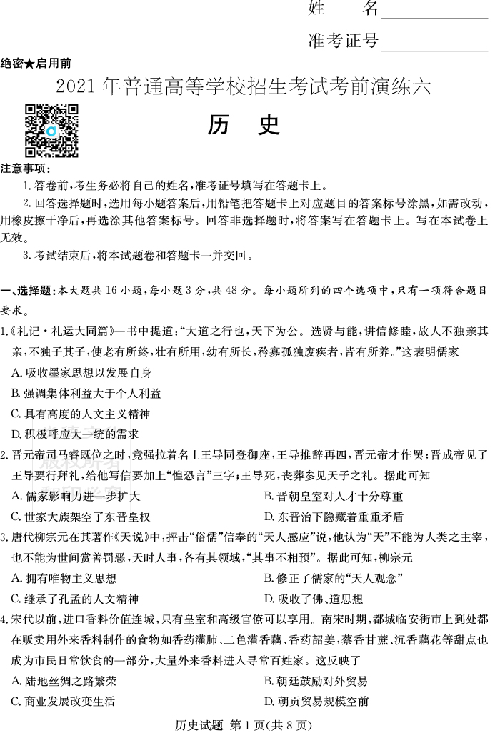 下一篇:【生物】2021年普通高等學校招生全國統一考試考前演練(六)