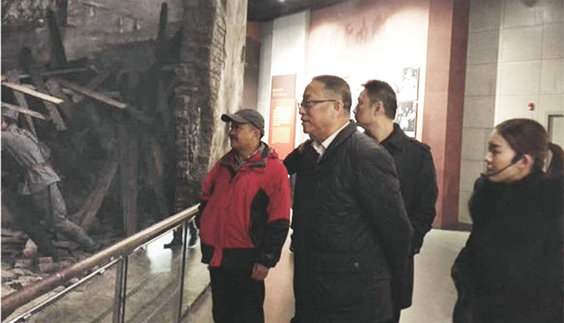 ▲湖南炎德文化實業有限公司董事長何譽軍(左一)陪同十四屆全國人大常委會副委員長,民革中央主席鄭建邦(左二)參觀湖南抗戰紀念館。