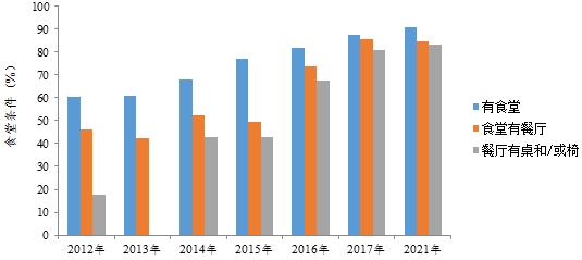 營養(yǎng)改善計(jì)劃實(shí)施過程中,各地不斷加大食堂建設(shè)力度,為推進(jìn)食堂供餐提供保障。2021年,在11857所監(jiān)測學(xué)校中,90.9%的監(jiān)測學(xué)校有食堂,食堂有餐廳的比例為84.4%,餐廳有餐桌、椅凳的比例為83.1%。監(jiān)測結(jié)果顯示,監(jiān)測學(xué)校中有食堂的比例逐年增高,從2012年的60.6%增長到2021年的90.9%。