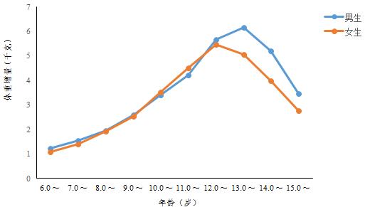 圖2 十年來監(jiān)測地區(qū)6~15歲各年齡段學(xué)生平均體重增量