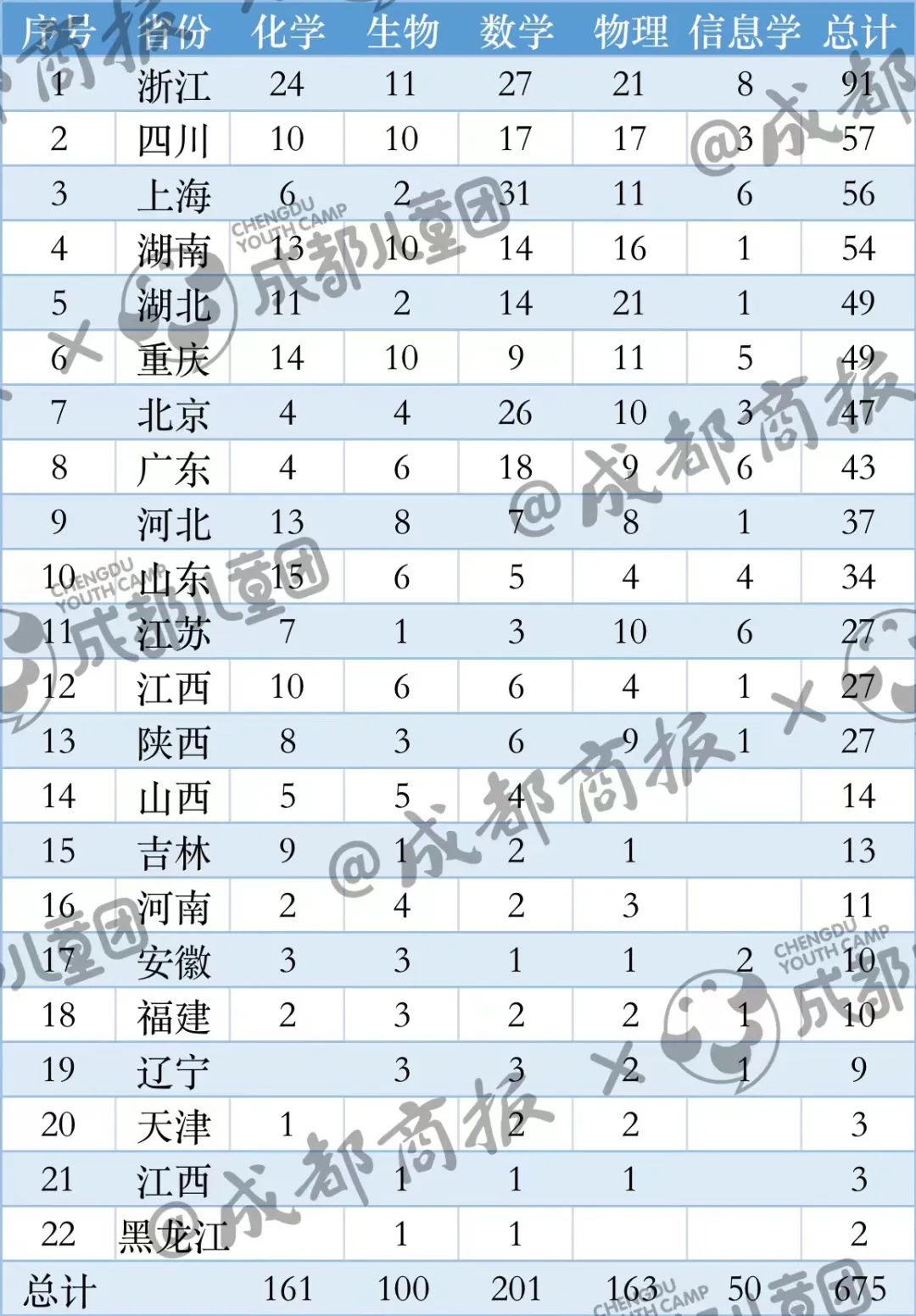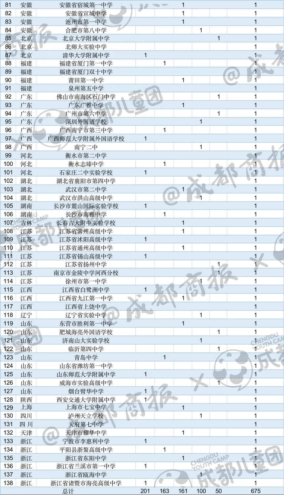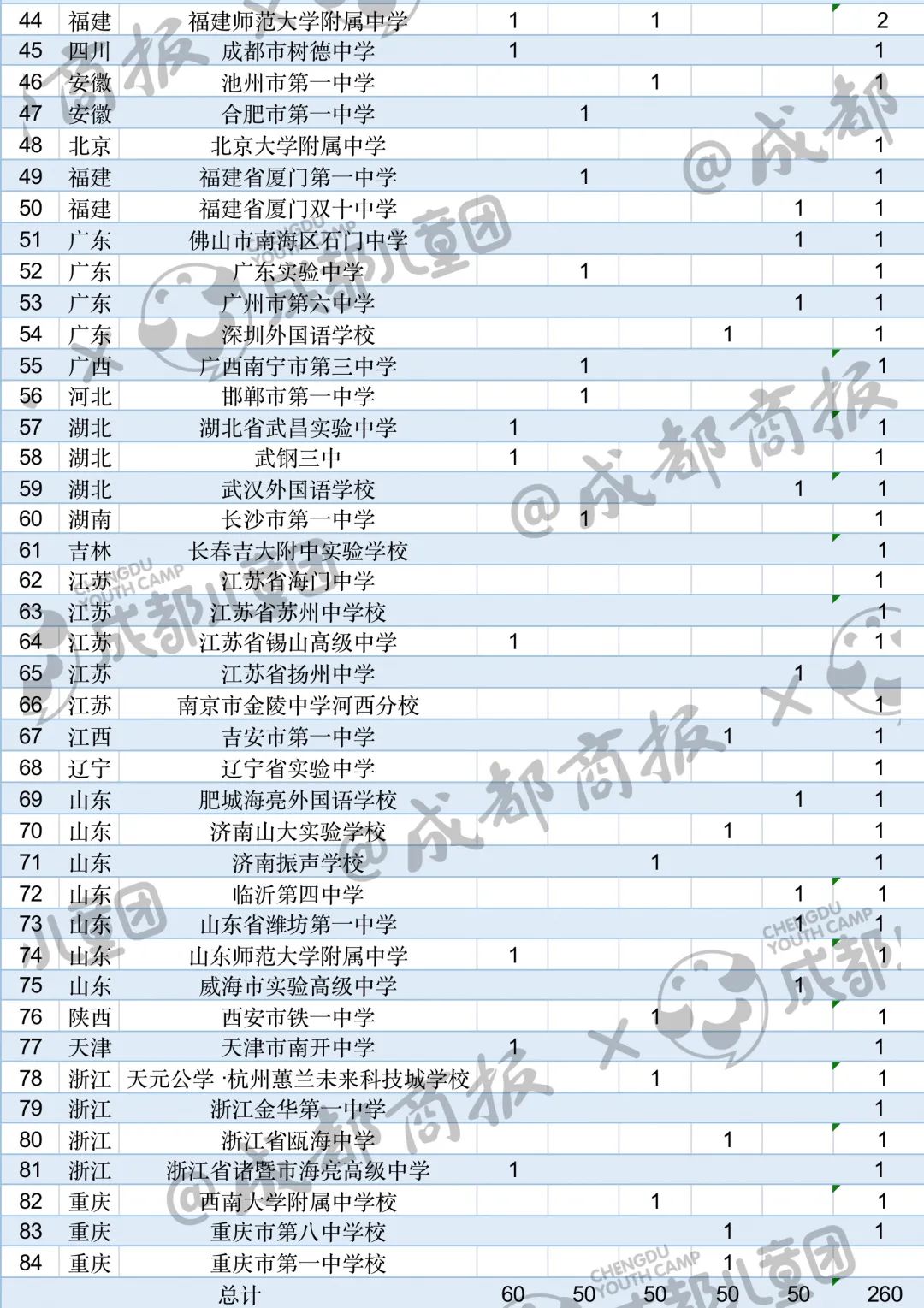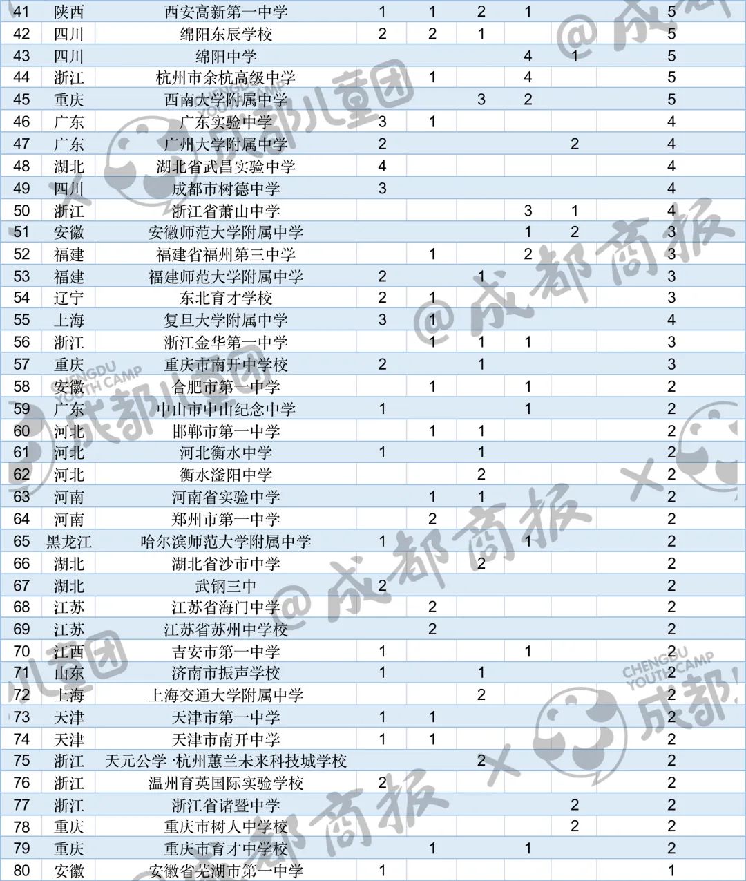 我們也單獨找出了四川的數(shù)據(jù),2022年,入圍“國集”的達到了26人,比去年增加9人,來自成都第七中學校、成都市樹德中學、成都外國語學校、成都市錦江區(qū)嘉祥外國語高級中學、綿陽中學、綿陽東辰學校等。