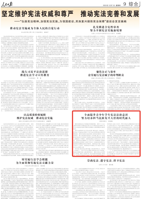 下一步,教育系統將深入貫徹習近平總書記重要指示精神,教育引導廣大青少年學生成為社會主義法治的忠實崇尚者、自覺遵守者、堅定捍衛者,為實現中華民族偉大復興作出新的更大貢獻。(“弘揚憲法精神,加強憲法實施,為強國建設、民族復興提供憲法保障”座談會發言摘編 本文刊發于《人民日報》2023年12月07日第09版)